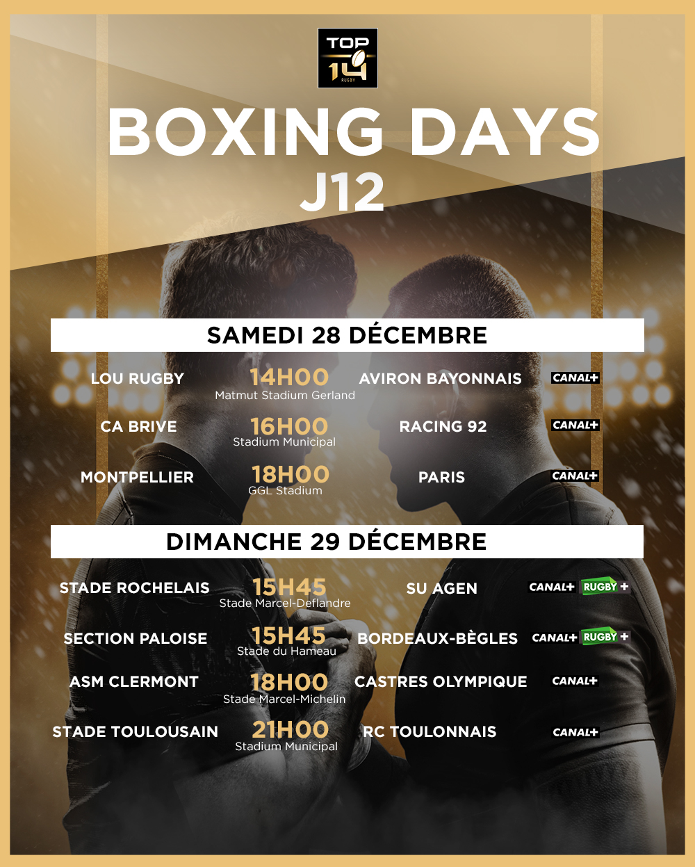 Cette année, les fameux Boxing Days se dérouleront les weekends du 21 décembre (TOP 14 & PRO D2) et du 28 décembre (TOP 14).