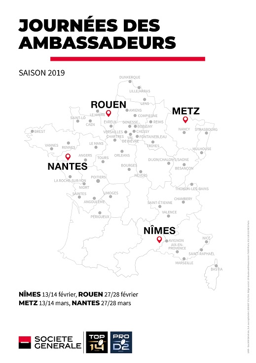Créées en 2005, et portées conjointement par la Ligue Nationale de Rugby et Société Générale, les Journées des Ambassadeurs ont pour but de renforcer le lien entre rugby professionnel et rugby amateur. A l’aube de sa 15e édition, elle est sans doute l’une des opérations les plus connues et appréciées dans le monde du rugby, puisque pendant deux jours, elle permet à des joueurs de TOP 14, PRO D2, entraîneurs, arbitres et anciens internationaux d’aller à la rencontre de passionnés du ballon ovale et de publics en appréciant les valeurs. Les agences locales Société Générale, les clubs de rugby, comités départementaux et ligues régionales, associés à chaque étape en assurent, en coordination avec la LNR, la parfaite organisation.