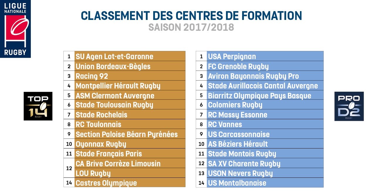 * Les clubs relégués en Fédérale 1 (US Dax Rugby Landes et RC Narbonne Méditerranée) ne sont pas évalués. Provence Rugby et l’US Bressane Pays de l’Ain, promus 2018/2019 en PRO D2, bénéficient du minimum garanti (100 000 € au titre du fonds d’aide aux Centre de formation).