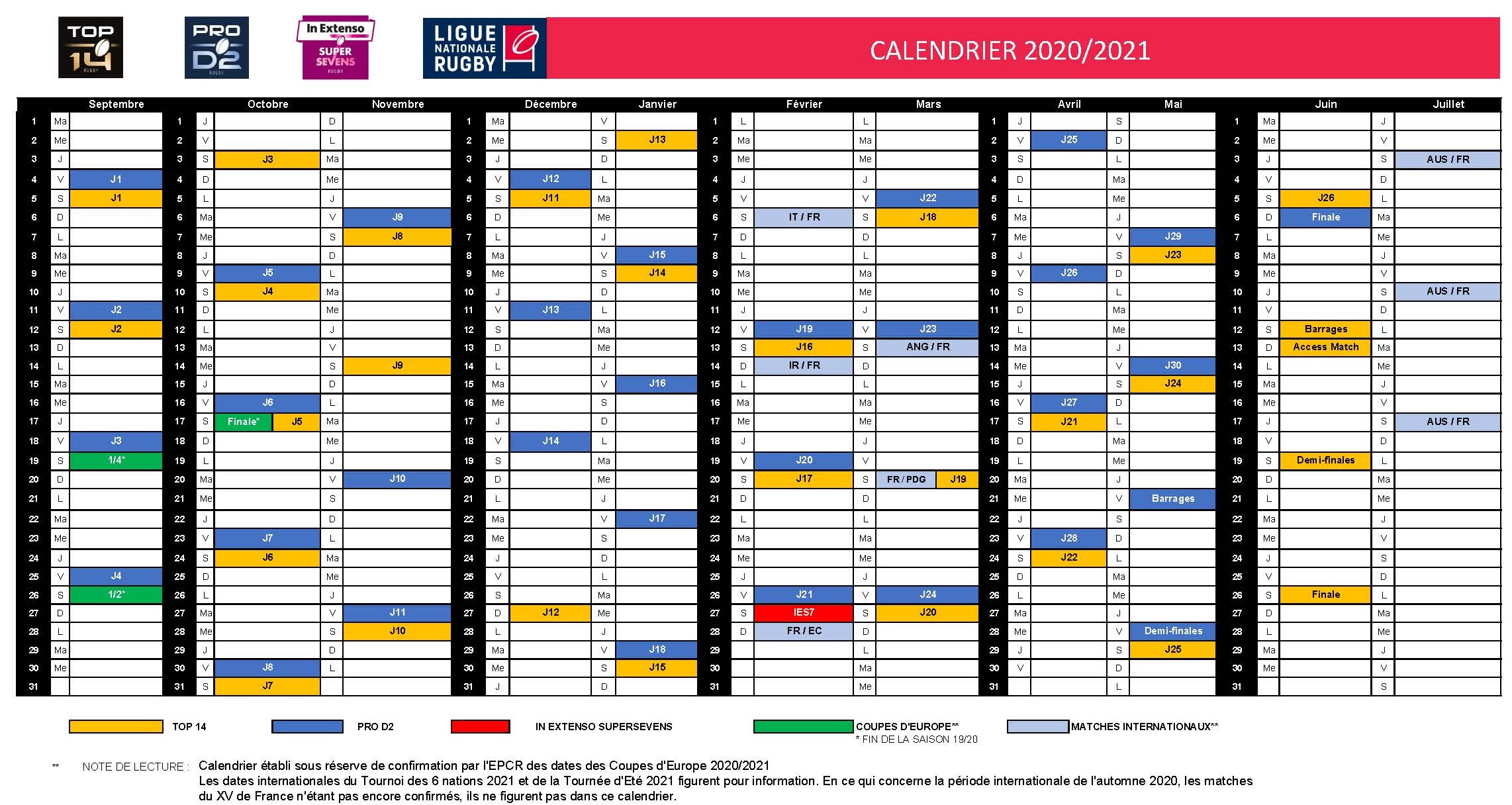 Le calendrier 2020-2021 prévoit une reprise commune pour le TOP 14 et la PRO D2 le premier weekend de septembre tandis que la finale du TOP 14 marquera la fin de la saison le dernier weekend de juin.